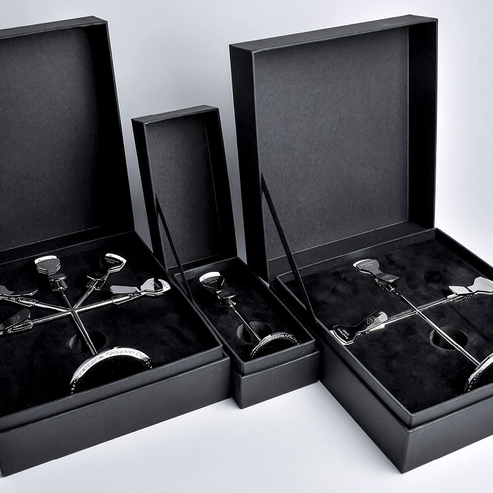 Personnalisez votre porte-mouillettes grâce à un choix de multiples teintes : or brillant ou mat, inox, noir brillant ou mat, or rose, blanc mat... ainsi qu'une gravure de votre logo (pinces et socles).
